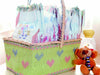 Decore un canasto de latón con una pieza de tela Aída bordada con un lindo diseño en punto cruz, y úsela como pañalera para el mudador de su guagua.