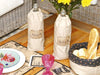 Los envases de bebidas opacan una linda decoración de mesa. Marcela nos propone disimularlos con unas sencillas bolsas de tela, que aparte de ser prácticas, contribuirán a adornar nuestra puesta en escena. Las hizo con algodón beige, y les puso una etiqueta de arpillera cosida con costura simple negra. En la etiqueta va escrito el nombre de la bebida que va cubierta, el que fue timbrado por Marcela. Arriba llevan elástico.