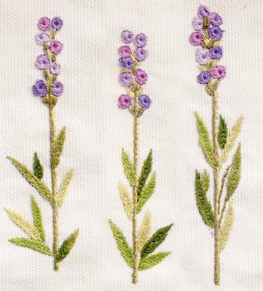 Ya sea para decorar ropa de cama, lencería o lo que usted desee, las Lavandas siempre aportan un toque lindo y romántico. Aquí le ofrecemos tres propuestas que puede replicar basándose en los dibujos que adjuntamos, utilizando las puntadas que se indican para lograr los distintos detalles. En este caso, se bordó con hilos Cadena. Ver paleta de colores N°1.