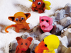 En los animalitos de la izquierda se usaron partes de las cajas de huevos (como las cavidades donde van los huevos, las separaciones entre ellas y las esquinas de las cajas), limpia pipas, ojitos para muñecos, goma eva, pompones, témpera, y plumones para hacer las terminaciones de los ojos.