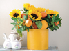 A Marie Shantal Lehmann le encanta armar sus composiciones florales en fanales para velas. En este caso, utilizó uno redondo de color naranjo, a tono con las especies que eligió: naranjas (1 kg), mandarinas (1 ½ kg) y siete girasoles (son muy durables, porque van abriendo de a poco día a día). Además, agregó pitosporo, como follaje (es ideal, porque se encuentra en muchos jardines y espacios públicos).